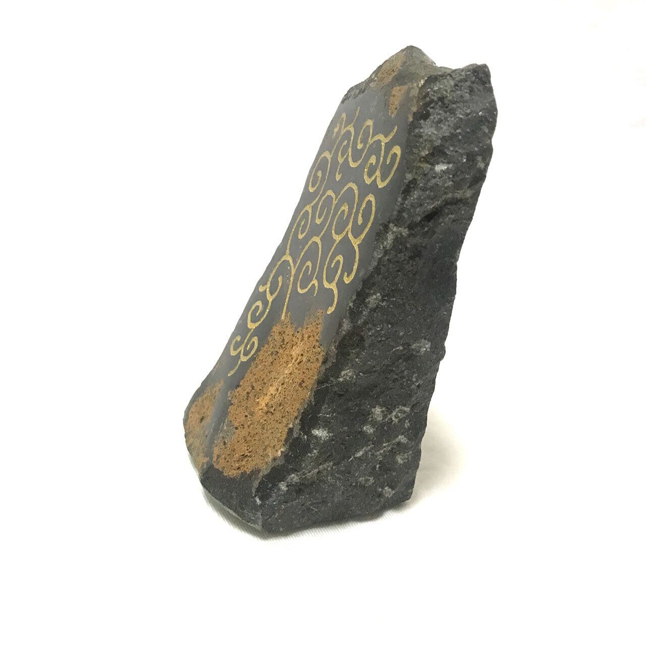 世界的に有名な彫刻家、イサム・ノグチが愛した事でも知られる両輝石安山岩に属する鉄分を多く含む火成岩です。世界で宮城県丸森町でしか算出されない石です。玉石の表面が泥のようなもので覆われていて黒と黄色の対比が美しい神秘的な石です。泥の様な部分は石に固着しており室内を汚すことはありません。年月を経ると黒く磨いた部分がやや赤味をおびてきます。黒い磨き部分は均一な黒ではなく模様や筋が入っています。石ごとにその模様は異なります。